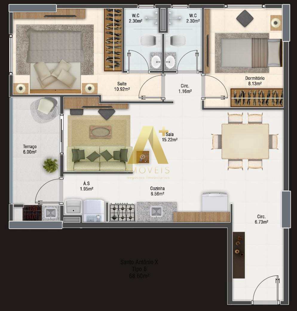 Apartamento contém 2 dormitórios sendo 1 suíte, sala para dois ambientes, cozinha, banheiro social, área de serviço, terraço e 2 vagas de garagem.