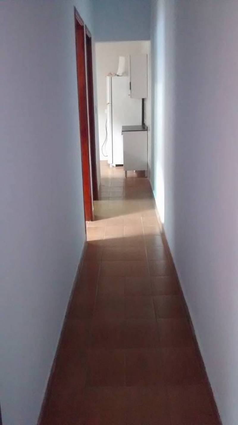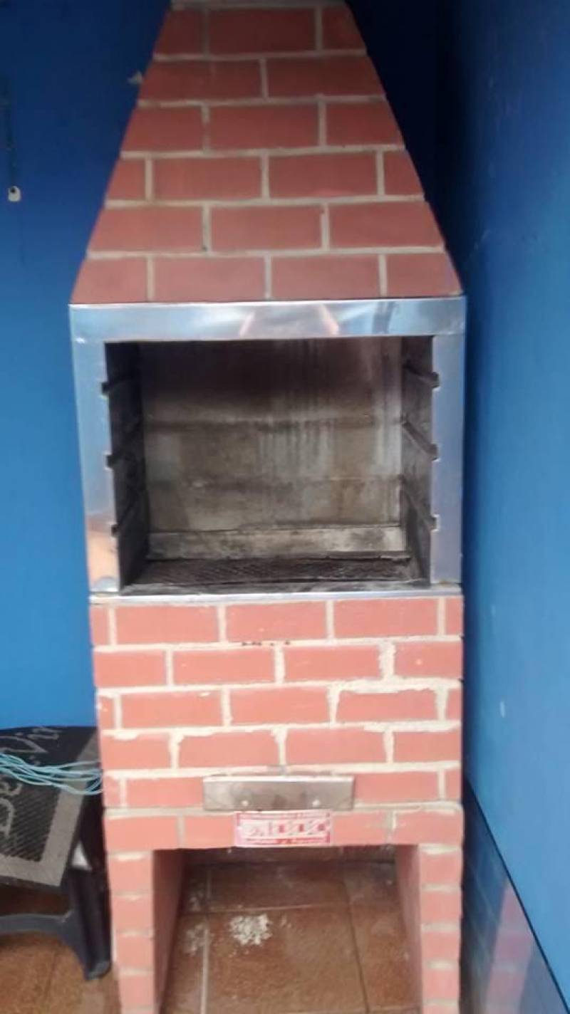 Área de churrasqueira e corredor coberto.